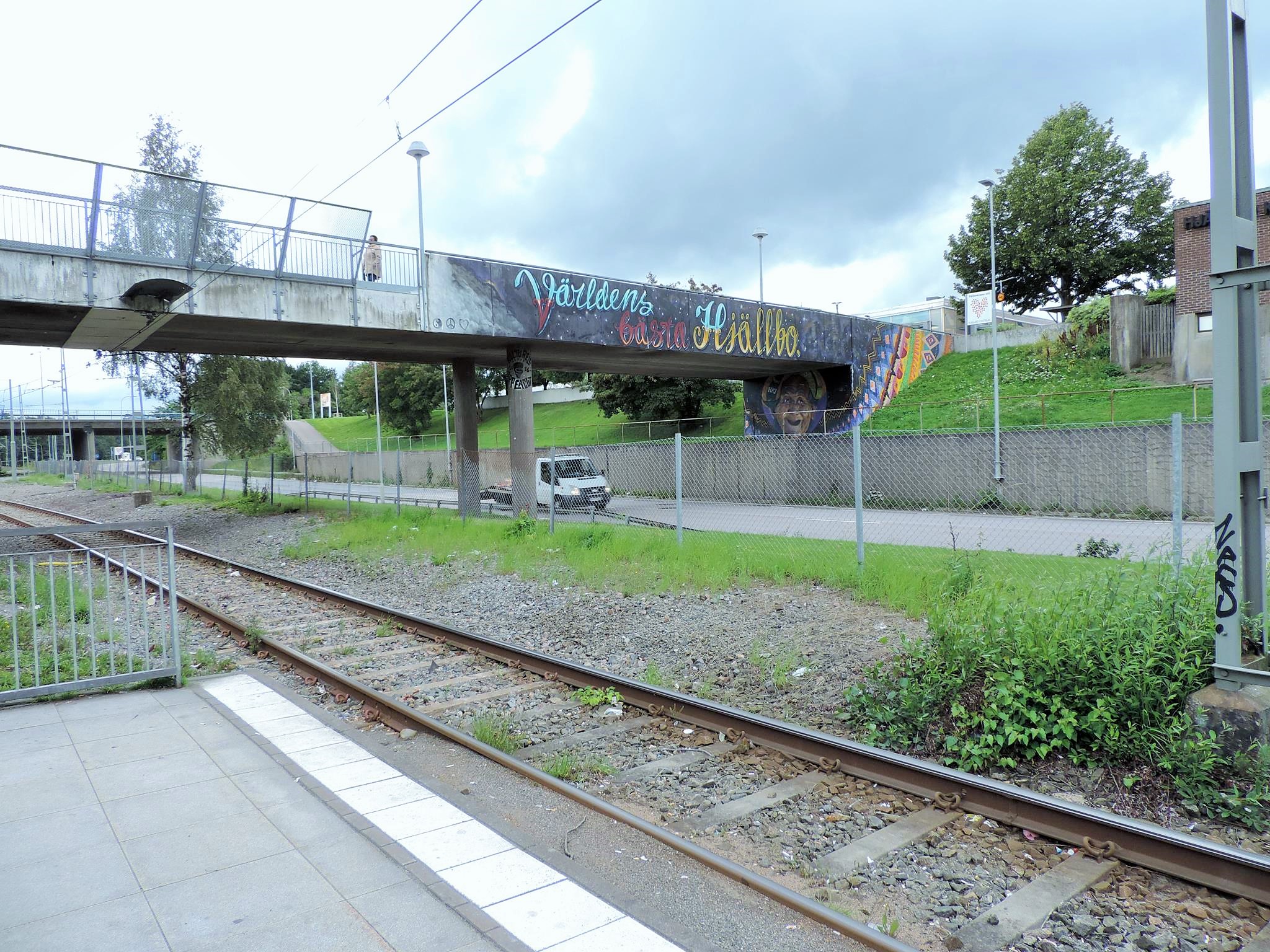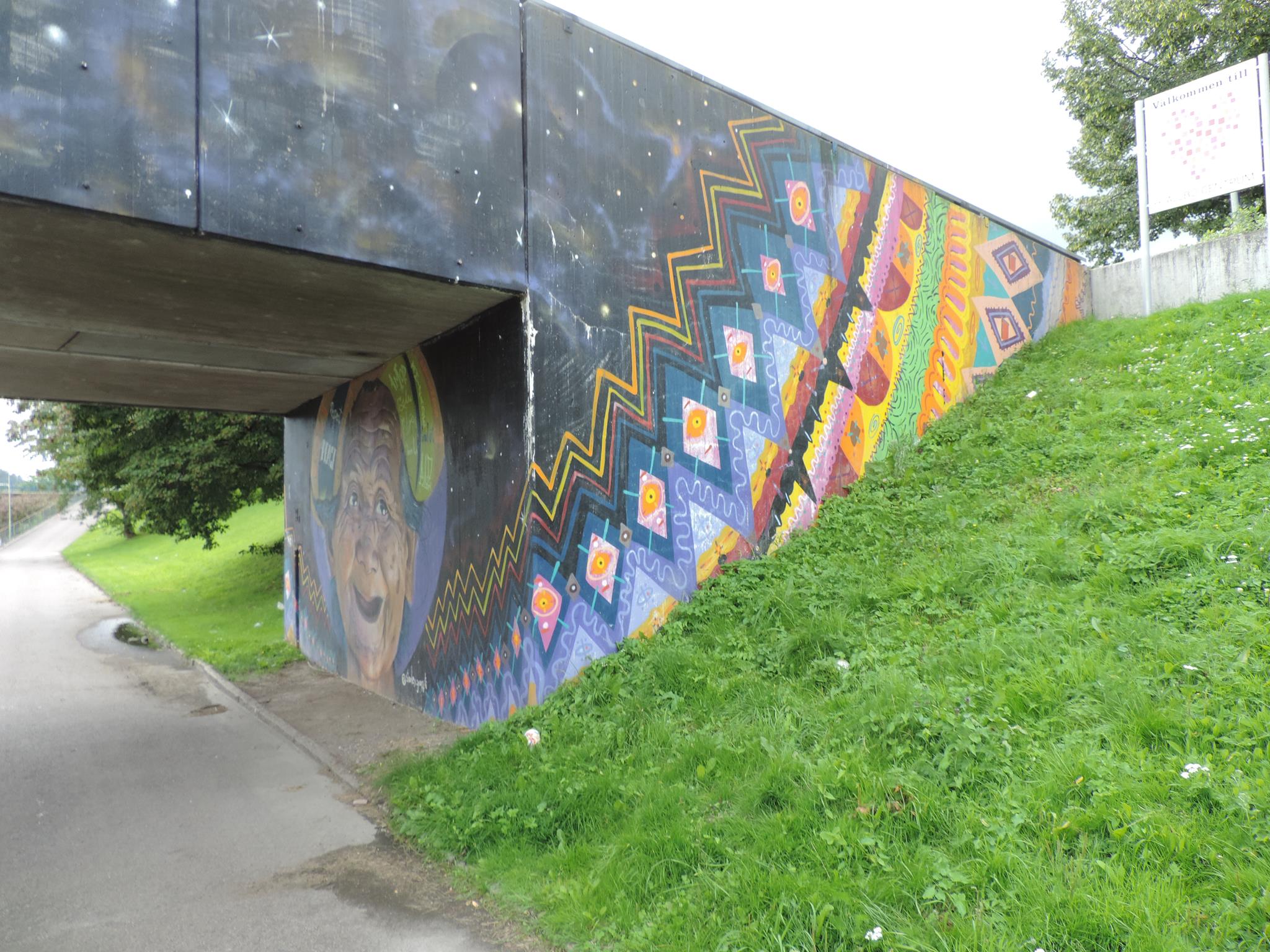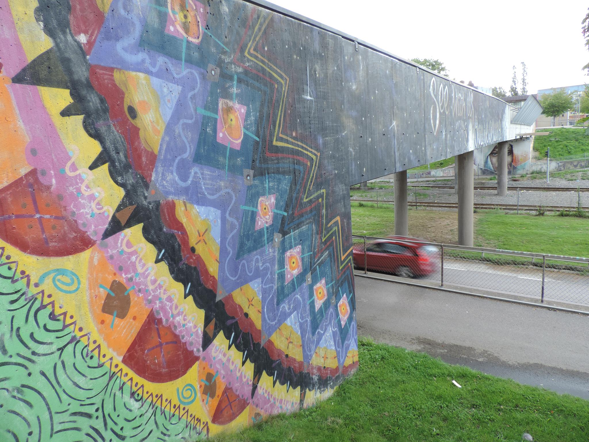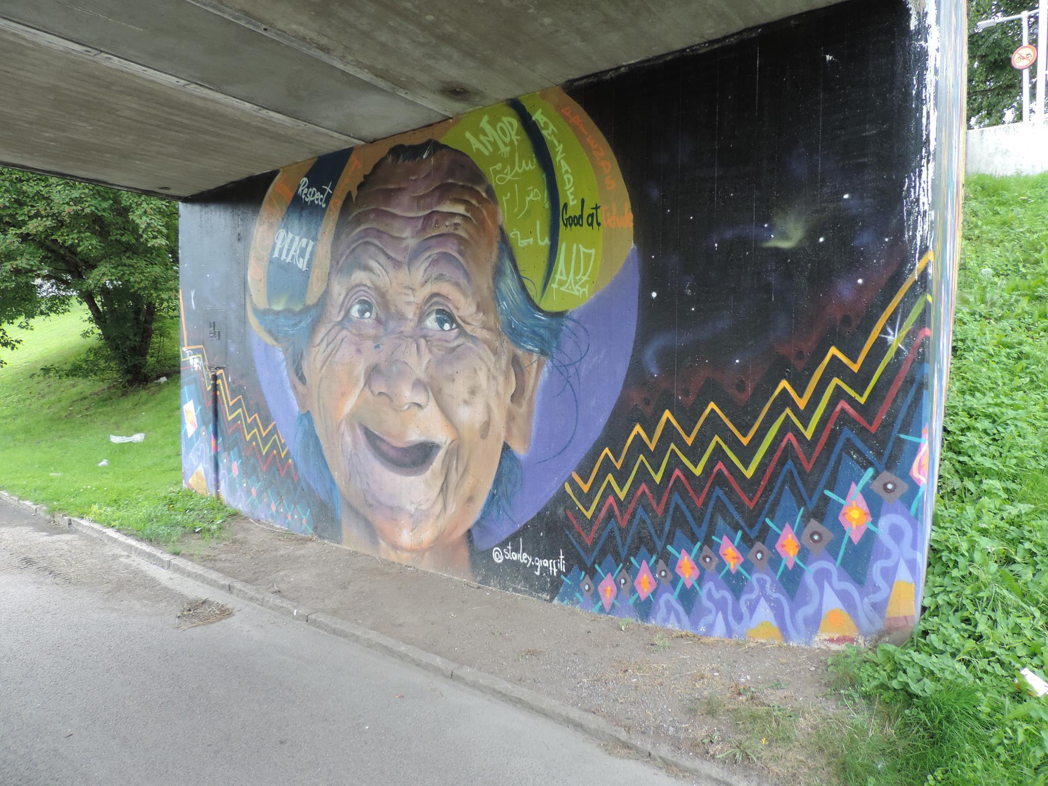 The artwork from STARLEY was made during the ARTSCAPE festival in 2016 on the walls of the pedestrian bridge at Hjällbovägen in the district Hjällbo. „Världens bästa Hjällbo“ means in English „The world’s best Hjällbo“. On the other side of the bridge is written „See with us, you be smiling“.