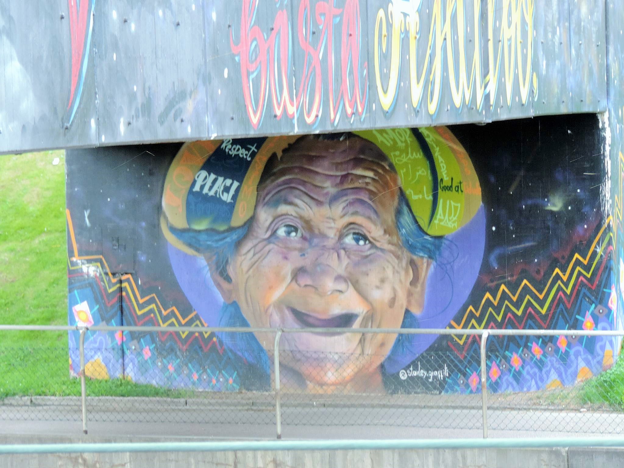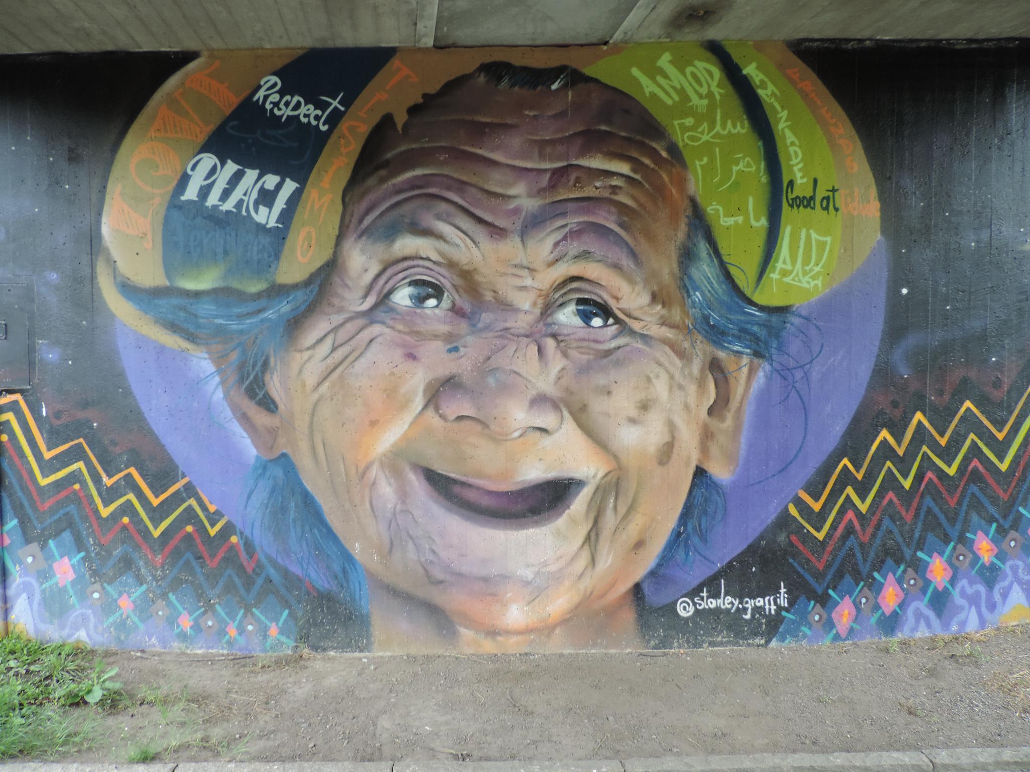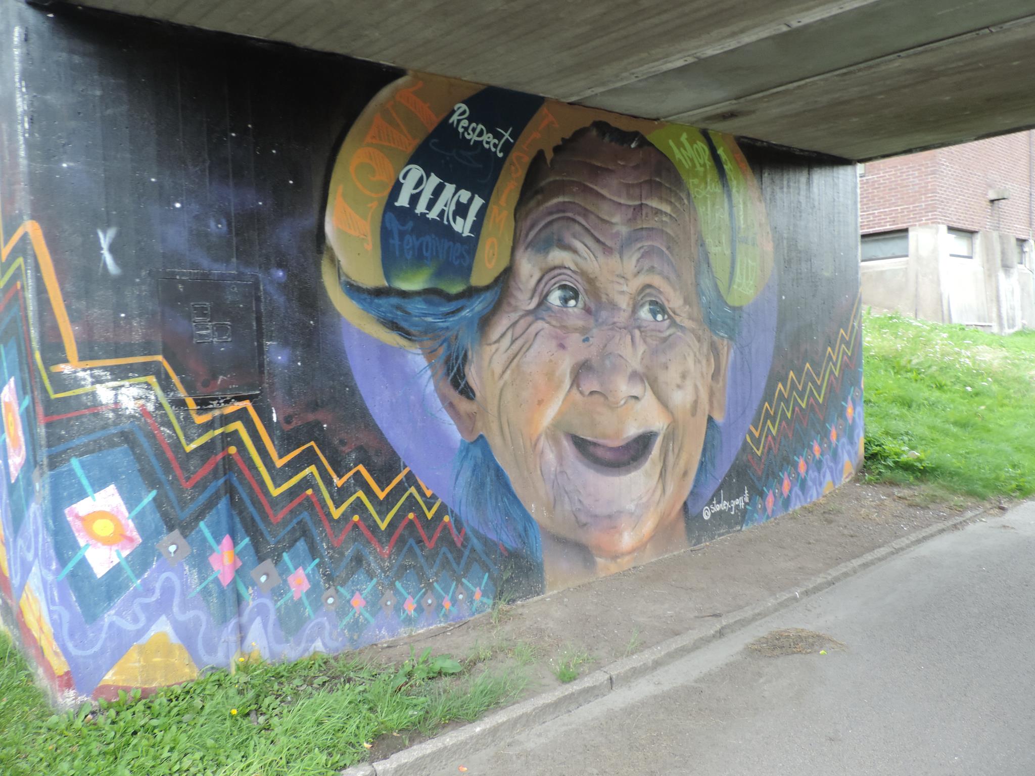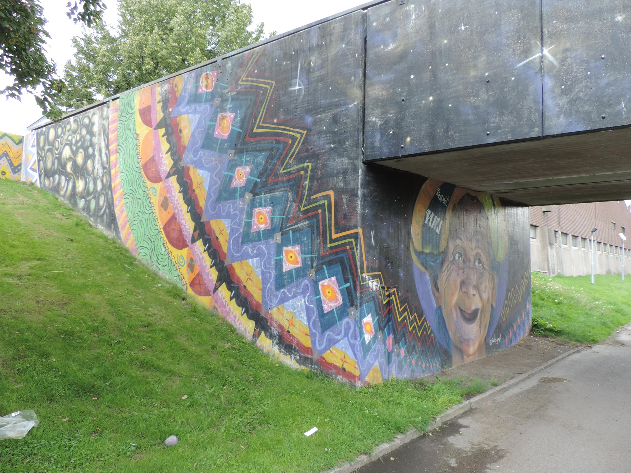 The artwork from STARLEY was made during the ARTSCAPE festival in 2016 on the walls of the pedestrian bridge at Hjällbovägen in the district Hjällbo. „Världens bästa Hjällbo“ means in English „The world’s best Hjällbo“. On the other side of the bridge is written „See with us, you be smiling“.