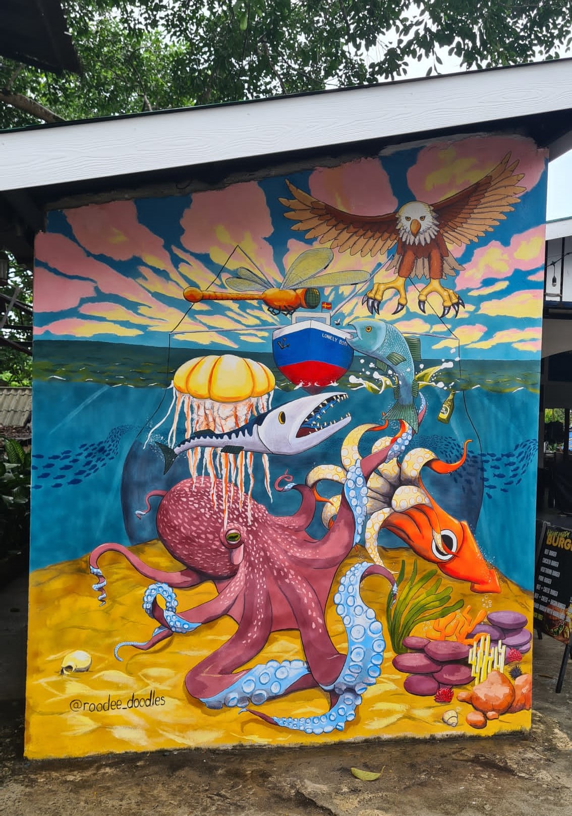 Koh Chang is one of the largest Thai islands in the south-east part of the Gulf of Thailand, notable for its dense, steep-sided rainforest. Recommended is the Mu Ko Chang National Park, which is a protected area with hiking trails and waterfalls such as the multi-tiered Klong Plu. The island is located close to the Cambodian border with several smaller islands around. Here is a collection of streetart and graffiti which we collected from this beautiful paradise, if you also have photos of urban art from this place, you can send them to info@vagabundler.com and we’ll add them to the page. Check out as well the individual page for the MEETING OF STYLES graffiti and urban art jam in 2024 on Koh Chang. The following photos were taken by world traveller PRAXI DELUXE aka PRAXINHO and Frankfurt artist SPOT aka CITYGHOST.