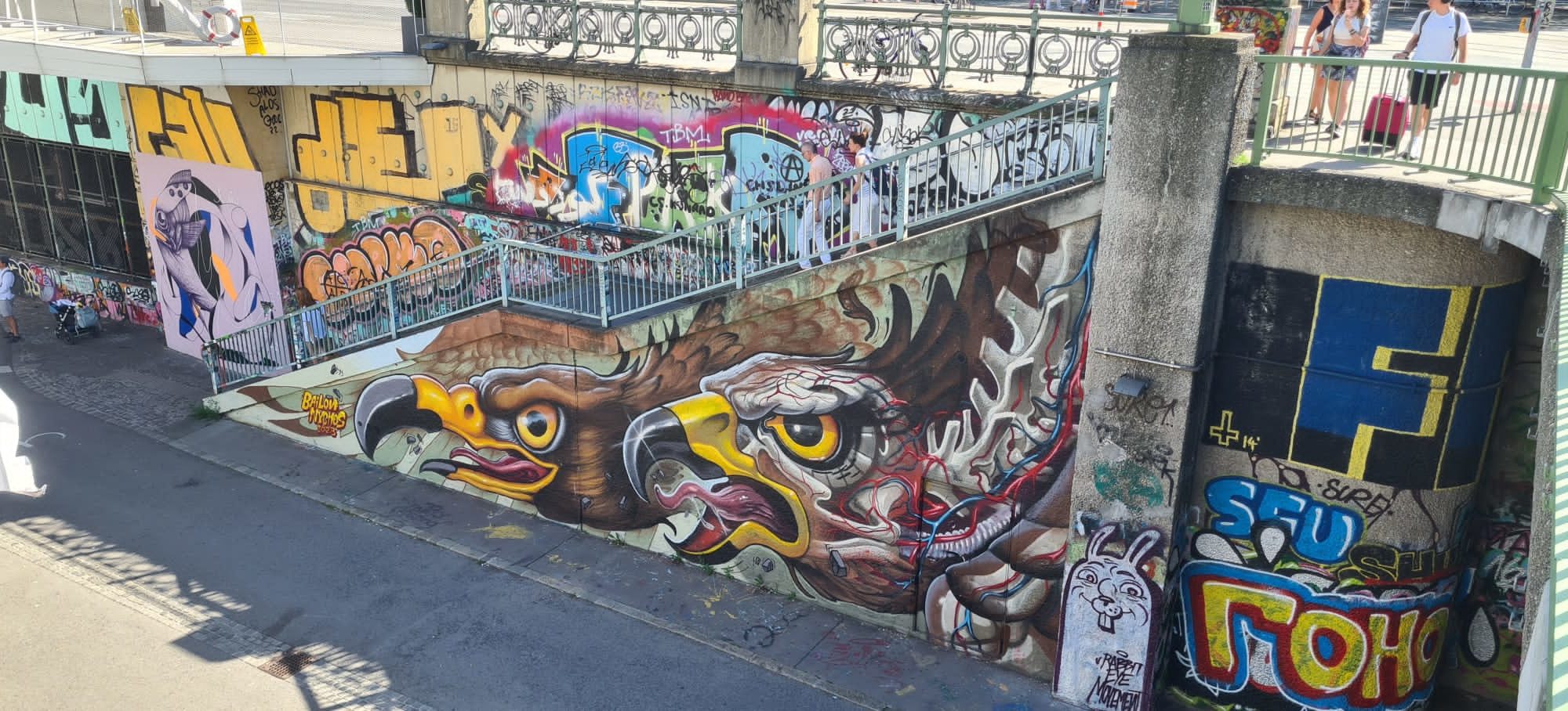 The Flex Hall of Fame is one of the first legal graffiti areas in Vienna and is located on the Danube Canal near Schottenring. This spot has been legal since around 1994, when the city of Vienna opened up the area for legal graffiti art. The name “Flex” comes from the legendary techno and electro club Flex. As well the various riverbank spaces and promenades around are open walls and approved for legal spraying, it’s a huge open-air gallery. The Donaukanal is also regularly a part of the awesome urban art festival CALLE LIBRE.