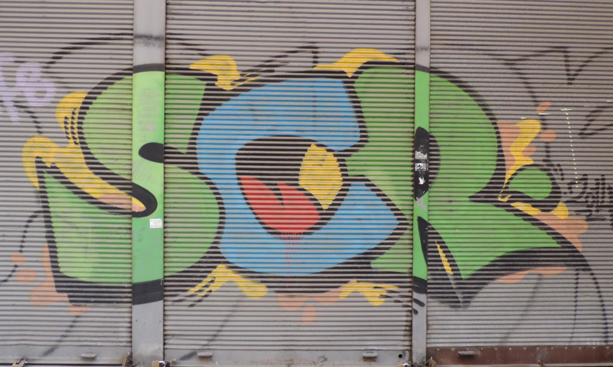 The character above is from unknown, the graffiti on the right were made by ORT, PAS, RACH and others, and the big mural which covers the building was made by KAOS